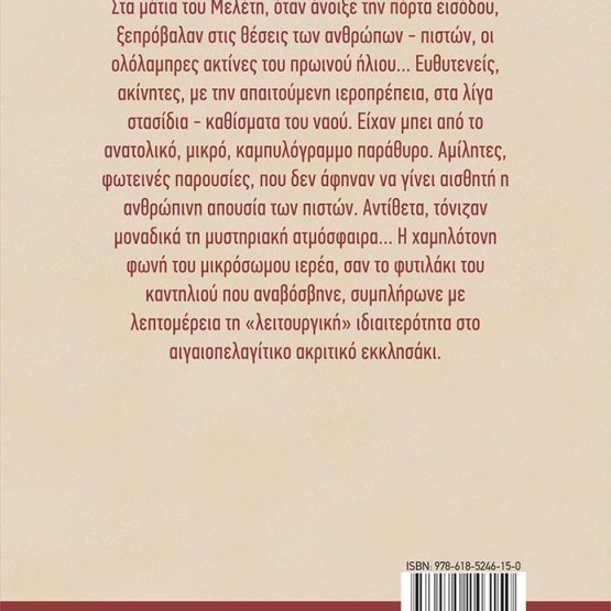 Στα µάτια του Μελέτη, όταν άνοιξε την πόρτα εισόδου, ξεπρόβαλαν στις θέσεις των ανθρώπων – πιστών, οι ολόλαµπρες ακτίνες του πρωινού ήλιου… Ευθυτενείς, ακίνητες, µε την απαιτούµενη ιεροπρέπεια, στα λίγα στασίδια – καθίσµατα του ναού. Είχαν µπει από το ανατολικό, µικρό, καµπυλόγραµµο παράθυρο. Αµίλητες, φωτεινές παρουσίες, που δεν άφηναν να γίνει αισθητή η ανθρώπινη απουσία των πιστών. Αντίθετα, τόνιζαν µοναδικά τη µυστηριακή ατµόσφαιρα… Η χαµηλότονη φωνή του µικρόσωµου ιερέα, σαν το φυτιλάκι του καντηλιού που αναβόσβηνε, συµπλήρωνε µε λεπτοµέρεια τη «λειτουργική» ιδιαιτερότητα στο αιγαιοπελαγίτικο ακριτικό εκκλησάκι.