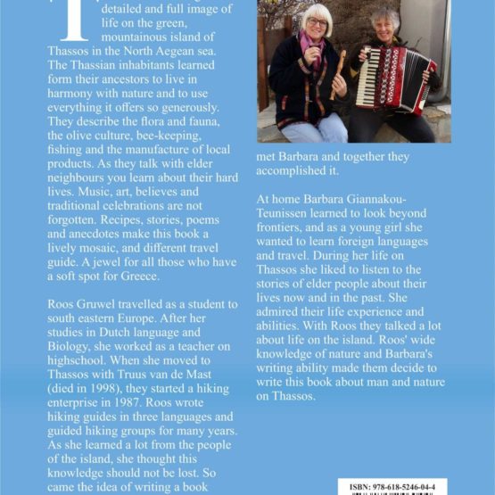 Δύο Ολλανδέζες γυναίκες δίνουν μια λεπτομερή και πλήρη εικόνα της ζωής, στο πράσινο ορεινό νησί της Θάσου στο βόρειο Αιγαίο πέλαγος. Οι κάτοικοι της Θάσου έμαθαν από τους προγόνους τους να ζούνε σε αρμονία με τη φύση και να χρησιμοποιούν ότι αυτή προσφέρει απλόχερα. Περιγράφουν τη χλωρίδα και την πανίδα, την κουλτούρα της ελιάς, τη μελισσοκομία, το ψάρεμα και την παραγωγή τοπικών προϊόντων. Καθώς συζητούν με γηραιότερους γείτονες, μαθαίνουν για τις γεμάτες δυσκολίες ζωές τους. Η μουσική, η τέχνη, οι πεποιθήσεις και τα παραδοσιακά πανηγύρια δεν ξεχνιούνται. Οι συνταγές, οι ιστορίες, τα ποιήματα και τα ανέκδοτα συνθέτουν σε αυτό το βιβλίο ένα ”ζωντανό” μωσαϊκό και έναν ξεχωριστό τουριστικό οδηγό. Ένα στολίδι για όλους όσους έχουν μια αδυναμία στην Ελλάδα.